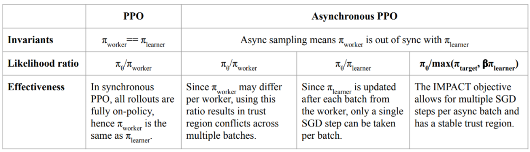 异步:全局策略参数的更新是异步的,或者说策略更新(由 learner 进行)和拉动(由 actor 进行)是异步的,即 actor 和 learner 通常拥有不同的策略参数。