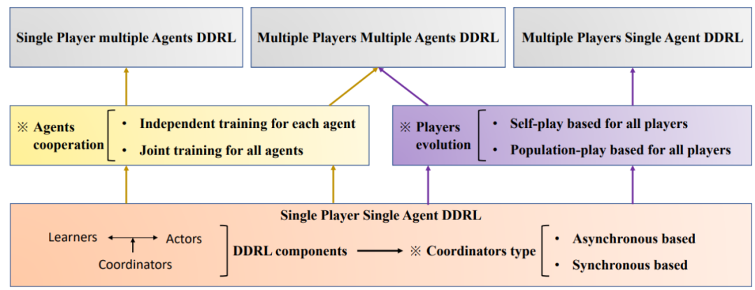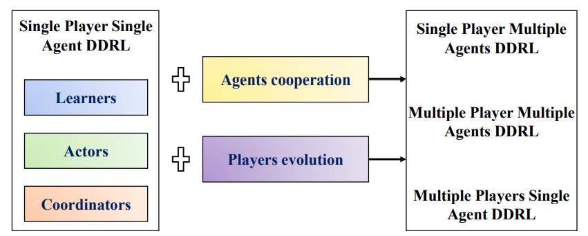 图 2. single player(agent) single agent DDRL 到 multiple players(agents) multipleagents DDRL