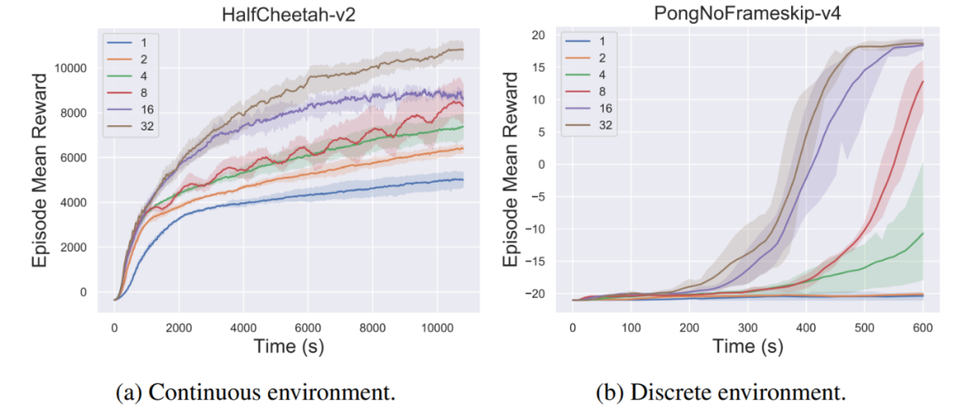 图 14. 在连续和离散控制任务中,IMPACT 在 worker 数量方面的表现