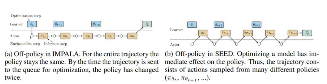 IMPALA 和 SEED 架构的不同之处在于,对于 SEED 来说,在任何时间点都只存在一个模型副本,而对于分布式 IMPALA 来说,每个 actor 都有自己的副本。这就改变了轨迹偏离策略的方式。在 IMPALA 中(图 16a),actor 在整个轨迹中使用相同的策略 π_θ_t。对于 SEED(图 16b)来说,轨迹展开过程中的策略可能会多次改变,后面的步骤会使用与优化时更接近的最新策略。