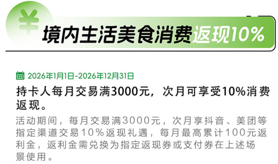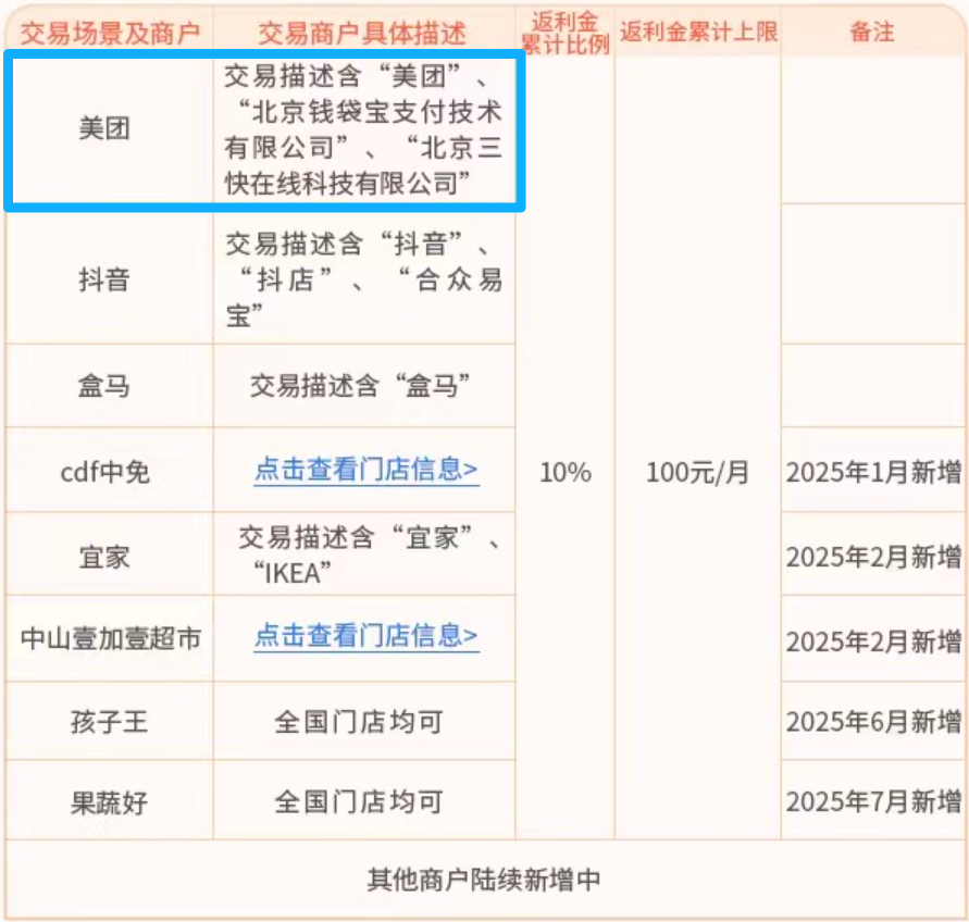 指定渠道消费10%返现:在美团、抖音、盒马、cdf中免、宜家、中山壹加壹超市、孩子王、果蔬好等商户消费,可以10%的比例累积“返利金”、月上限100返利金。