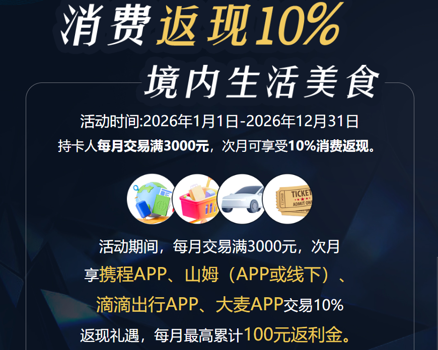 大湾区版,针对境内生活美食消费:携程、山姆、滴滴、大麦等,消费可获得10%返现。