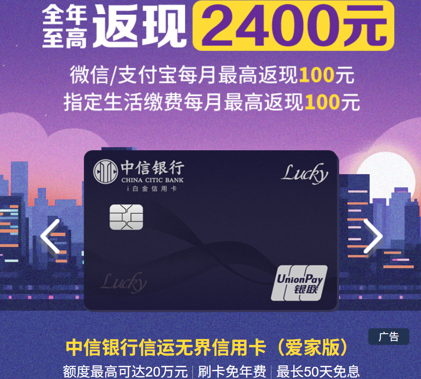 中信的信运系列卡片,到目前为止有四张,分别是:爱吃版,爱行版,爱家版和大湾区版。玩法和万事达i白金卡大同小异,指定商户消费可获得高返现,但是比i白金多了一个“支付宝/微信/云闪付”消费1%返现。