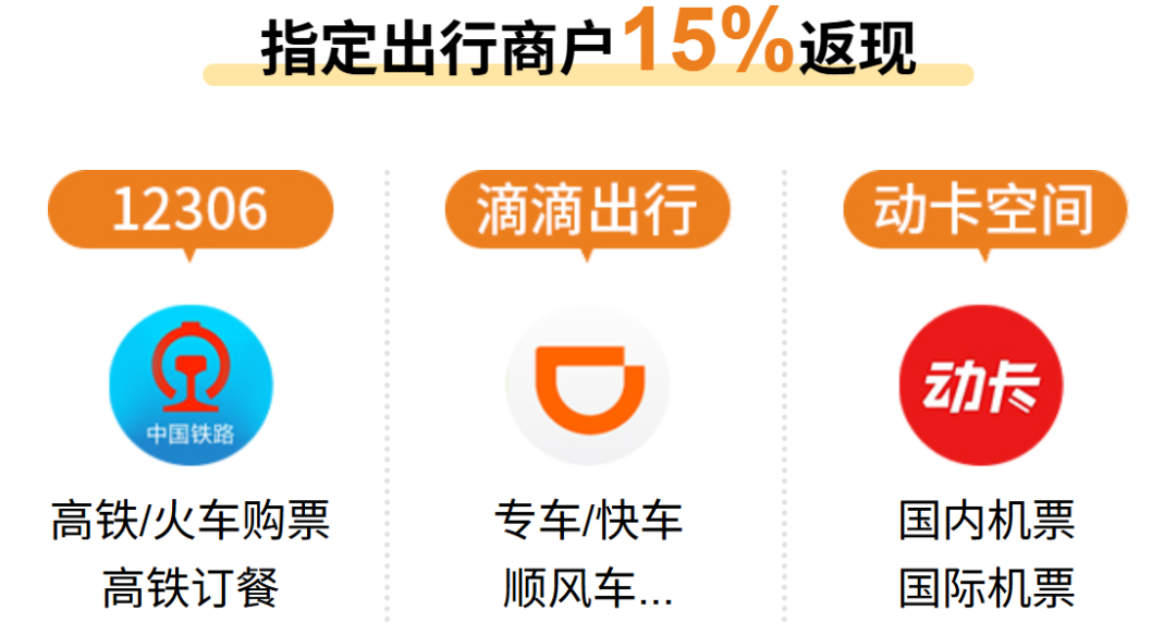 爱行版,针对出行消费:火车票、滴滴、机票(需在“动卡空间app购票”)等,消费可获得15%返现;
