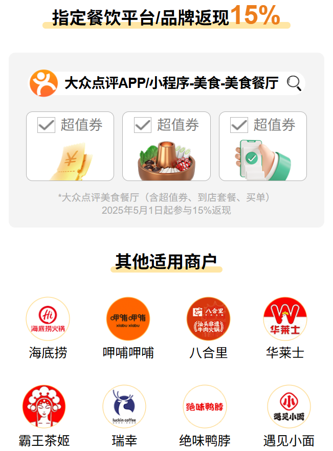 爱吃版,针对餐饮商户:大众点评、海底捞、霸王茶姬、华莱士、瑞幸等,消费可获得15%返现;