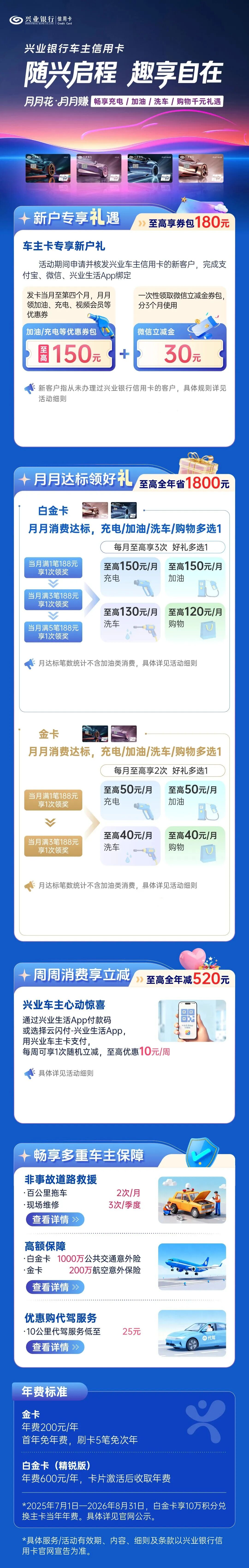 3、兴业车主精锐白金卡适合有车的同学,尤其是电车,每年省1800元真不是小打小闹。