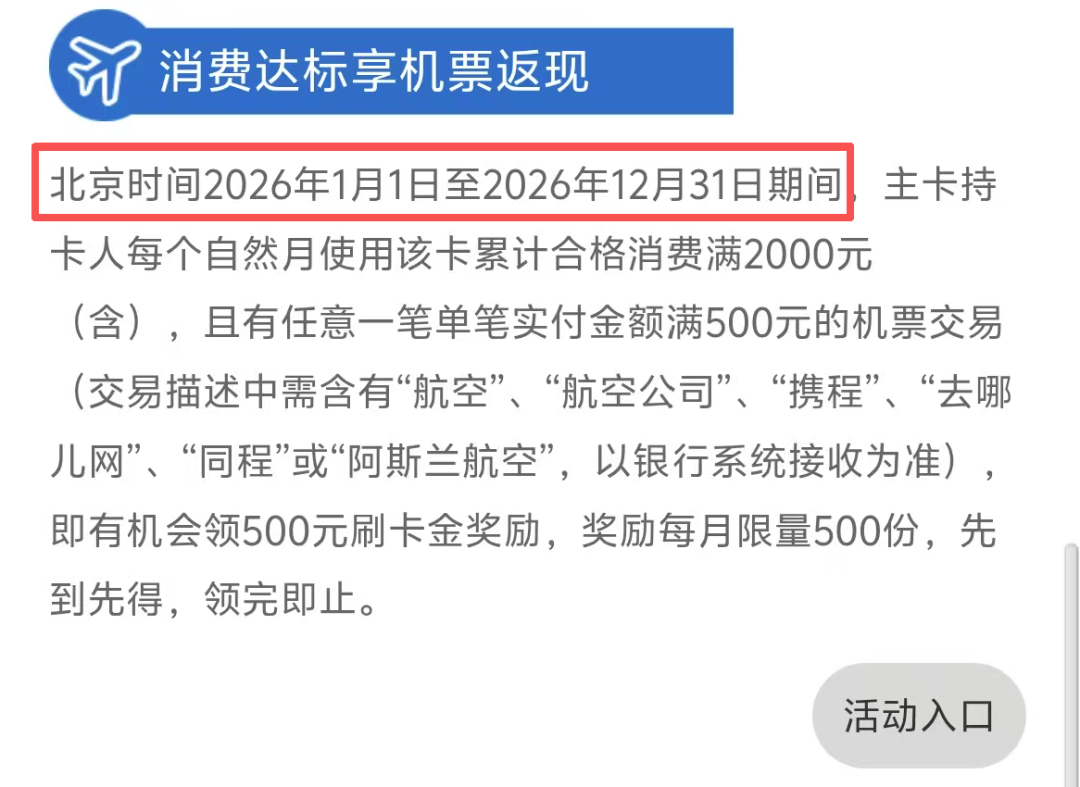 浦发Safari这张卡去年写过多次,默认的年费/权益非常一般,但是去年底有消费达标变相返还首年年费活动,那就很香了(今年不知道会不会有,蹲蹲看)。这张卡除了商旅出行权益,最大的亮点是每月机票交易达标可领500元刷卡金,堪称大羊腿。