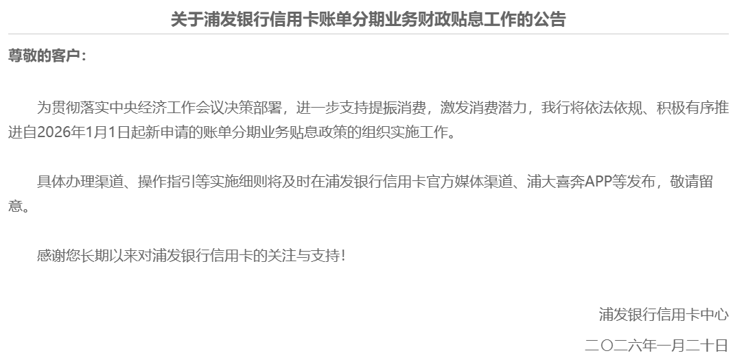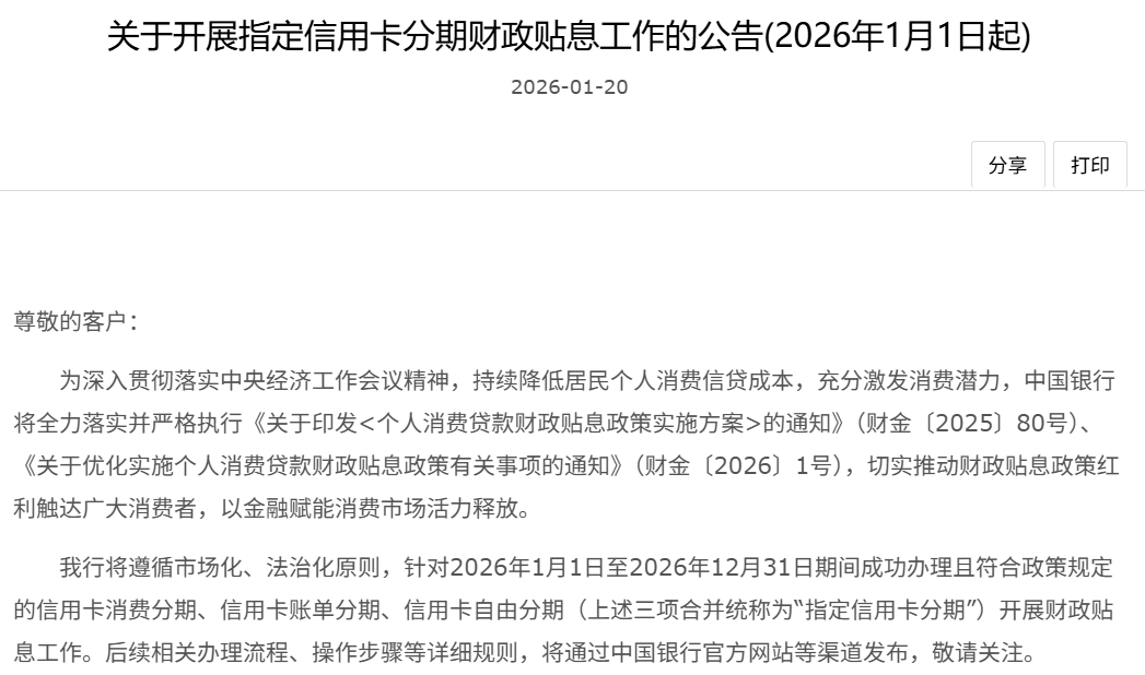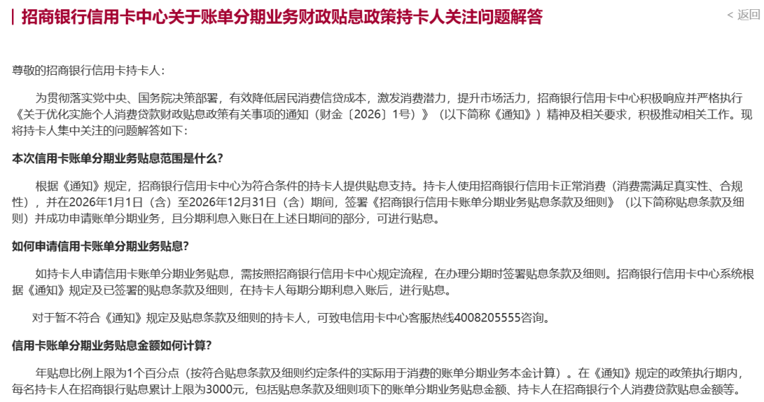 用一句话概括就是:从2026年1月1日起,人消费贷款财政贴息政策将把信用卡账单分期业务纳入支持范围,借款人在每家银行每年最多可享3000元贴息。