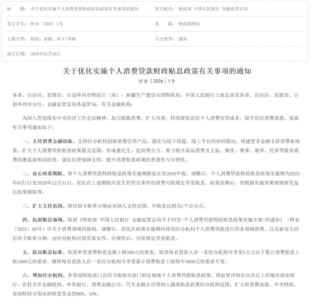 延长政策期限。将个人消费贷款财政贴息政策实施期限延长至2026年底。调整后,个人消费贷款财政贴息政策实施期为2025年9月1日至2026年12月31日。
