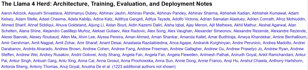 尽管如此,这篇报告还是将 Llama 4 项目的所有参与者都加入到了作者名单中 —— 超过 1300 名,足足 5 页!因此,我们可以大体上认为这份报告就是来自 Llama 4 团队,尽管其中不少人现在已经从 Meta 离职,比如前 Meta FAIR 团队研究总监。