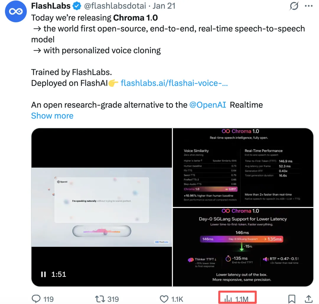 Chroma 1.0 发布之后,便在社媒爆火,吸引了大量的关注。X 上的官推帖子已经突破了百万浏览量。