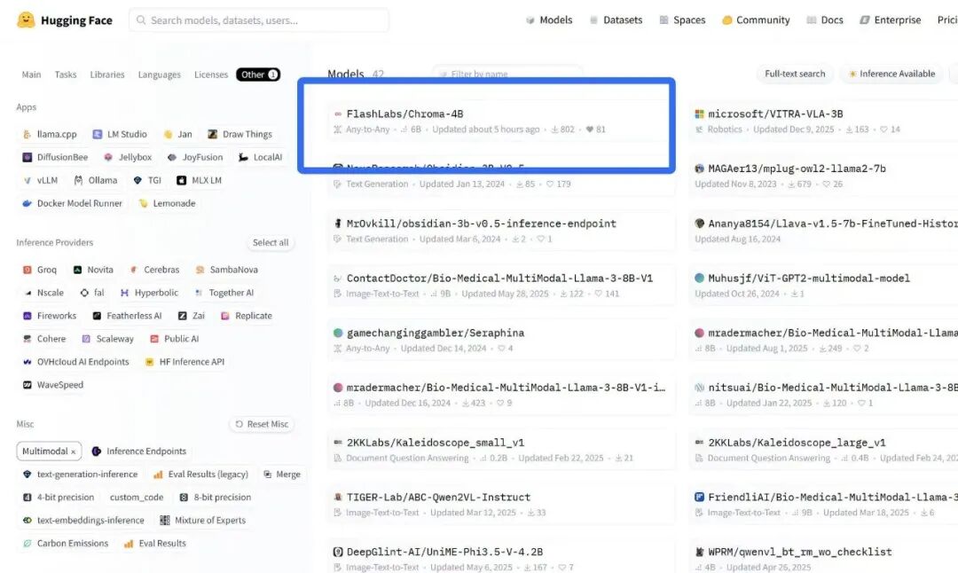 此外,在 HuggingFace 多模态榜单中,Chroma(4B 版本)排名第一。