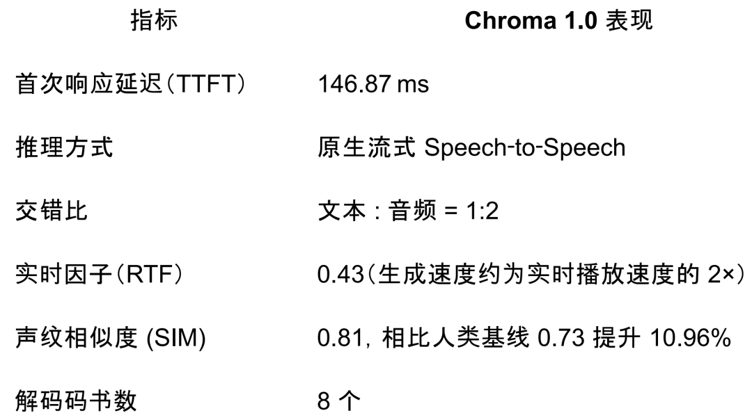 Chroma 1.0 的模型规模约为 40 亿参数级别。相较于追求超大模型规模,其设计更强调在延迟、吞吐与可部署性之间取得平衡:
