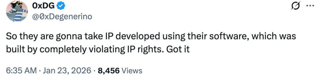 「所以,OpenAI 打算从用户使用其软件开发的知识产权(IP)中抽取分成,而他们自己的软件,却又是通过侵犯他人的知识产权构建出来的。」