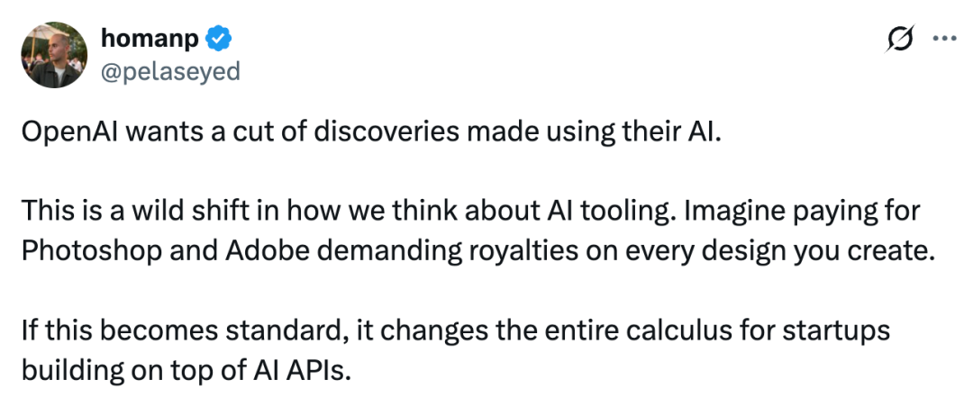 有人认为,这可能是对 AI 工具化认知的一次巨大颠覆。想象一下,如果你在使用 Photoshop,而 Adobe 却要求对你创作的每一件设计作品抽成。