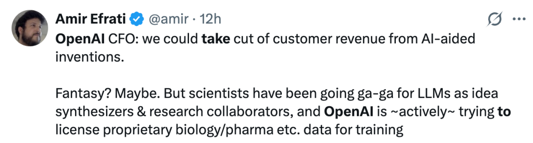 这意味着,OpenAI 可能正在考虑从「卖工具」转向「分利润」的商业模式。OpenAI 似乎不满足于只收「软件使用费」,而是想在客户发财时「抽成」。