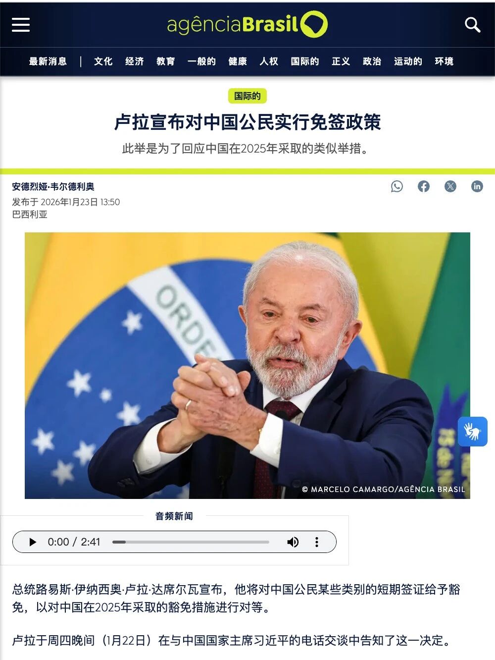 巴西总统卢拉宣布,将对部分短期签证类别的中国公民实行免签政策,以回应中国对巴西公民的免签措施,具体细节待公布。这是继土耳其、菲律宾之后,又一个对华免签的国家,中国护照的含金量持续上升。这意味着中国游客前往巴西旅游将更加便利,有望带动南美旅游热潮。