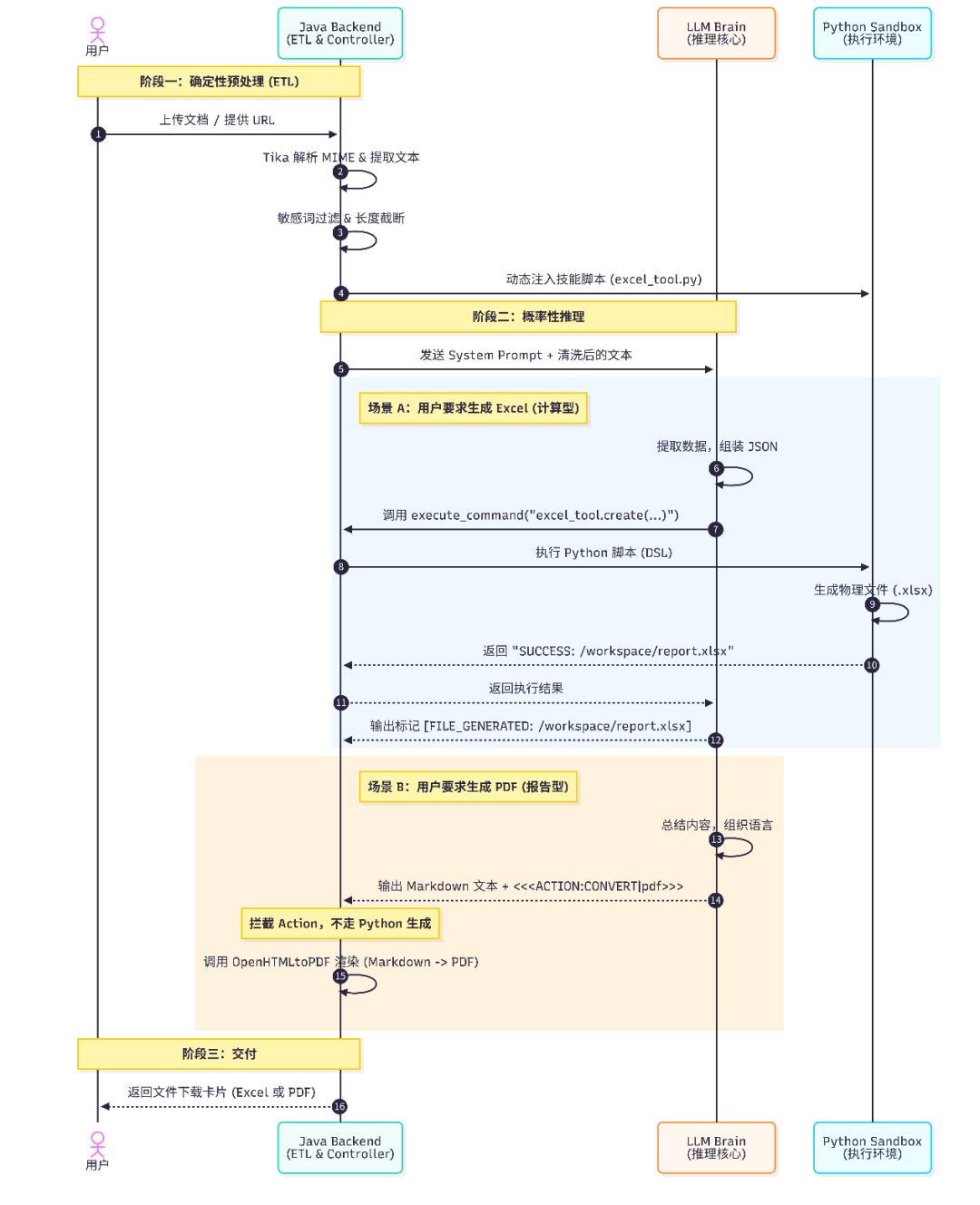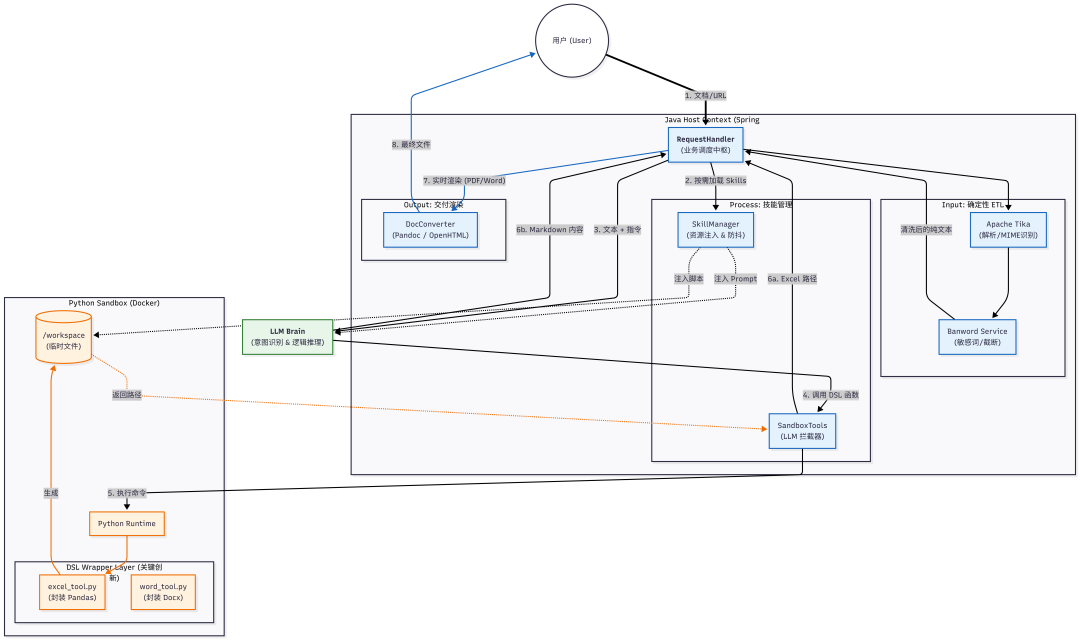 我们不再让 LLM 去下载和解析文件。所有输入文件,先经过 Java 的 DocPipeline。利用 Apache Tika 进行精准解析,并立即进行 敏感词检测 和 文本截断。这一步保证了 喂给 LLM 的数据是干净、安全、标准化的纯文本。