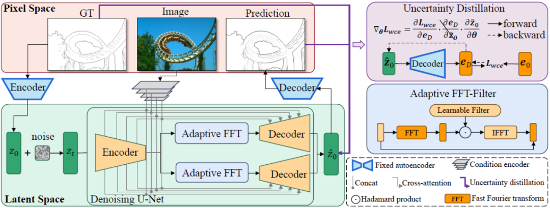 本文所提出的 DiffusionEdge 方法总体框架如图 2 所示。受以往工作的启发,该方法在隐空间中训练具有解耦结构的扩散模型,并将图像作为额外的条件线索输入。该方法引入了自适应傅里叶滤波器来进行频率解析,且为了保留来自多个标注者的像素级不确定性信息并减少对计算资源的要求,还以蒸馏的方式直接使用交叉熵损失优化隐空间。