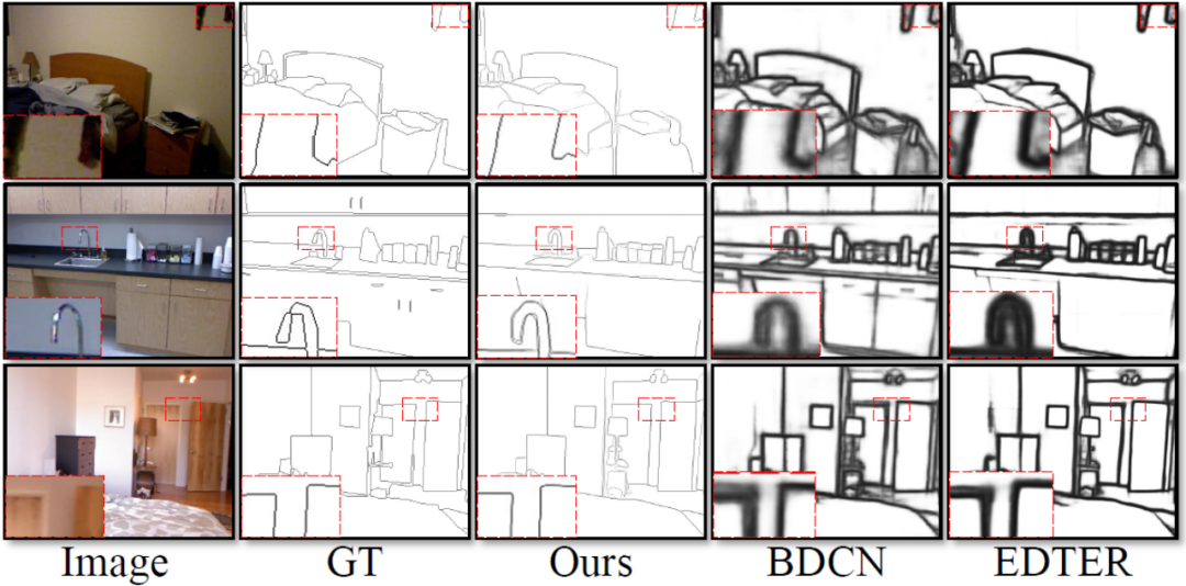 基于深度学习的方法通常采用包含上下采样的编解码结构集成多层特征 [1-2],或是整合多个标注的不确定性信息以提升边缘检测的准确度 [3]。然而,天然受限于这样的结构,其生成的边缘结果图对于下游任务来说太过粗厚而严重依赖后处理的问题仍然亟待解决。尽管许多工作已经在损失函数 [4-5] 和标签修正策略 [6] 方面做出了探索以使网络能输出更细的边缘,但本文认为该领域仍然需要一个可以不借助任何额外模块,就能直接满足准确度和细度的边缘检测器,而无需任何后处理步骤。