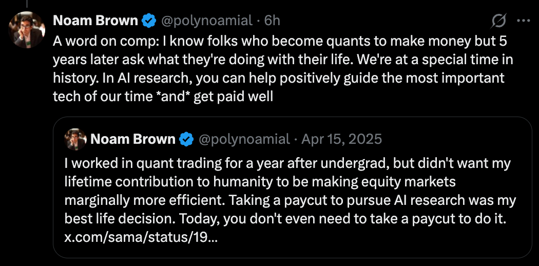在分享的最后,Noam Brown 谈到了一个更深层的问题:薪酬。
