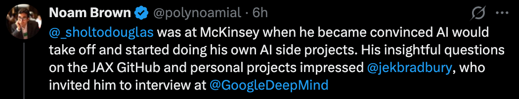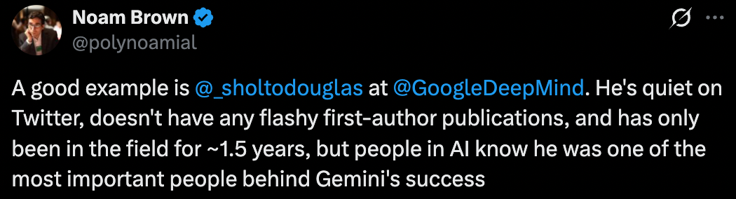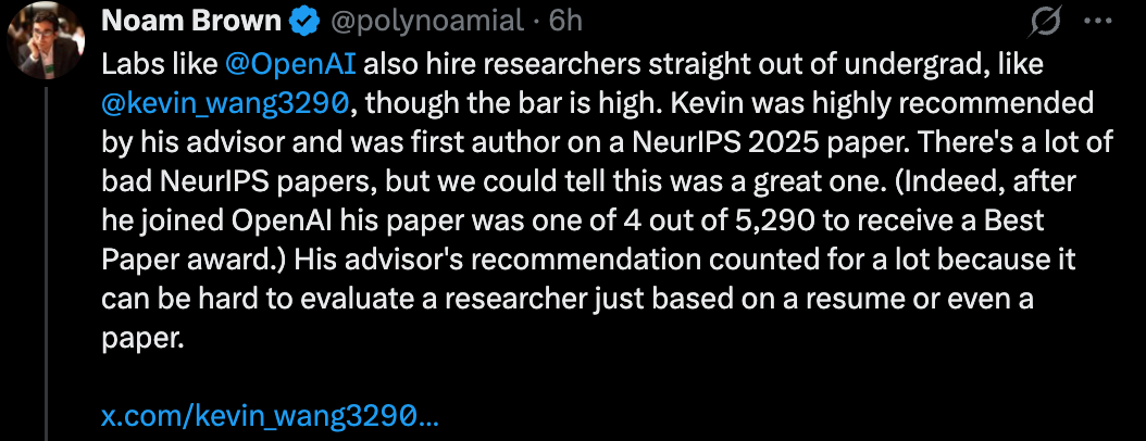 Noam Brown 特别提到,导师的推荐在这里起了很大作用,因为仅凭简历甚至论文来评估一个研究者的潜力是很困难的。