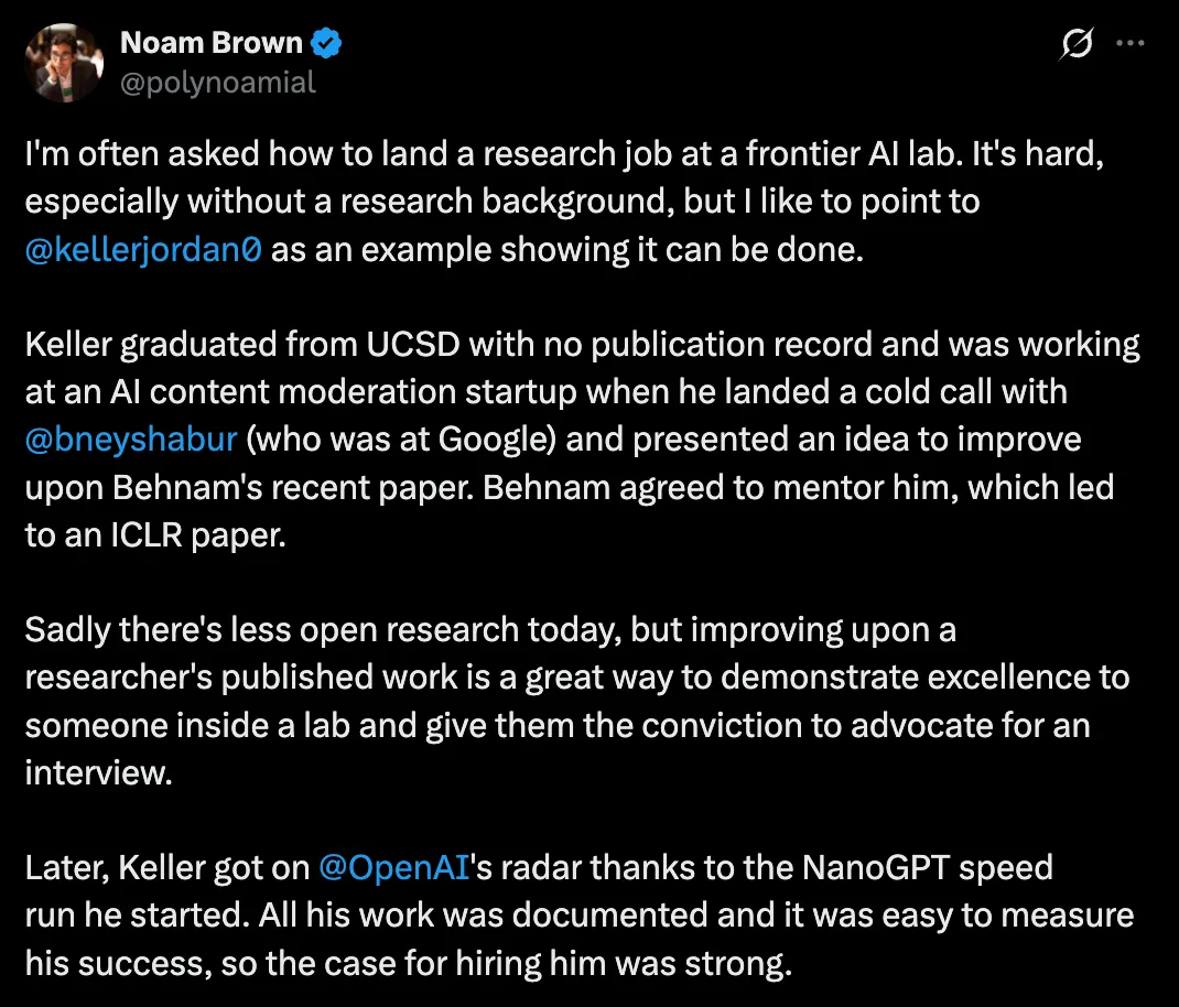 最近,OpenAI 资深研究科学家 Noam Brown 在 X 上分享了几个真实故事,证明了通过个人努力和巧妙策略,即使没有传统学术履历,也能获得机会。