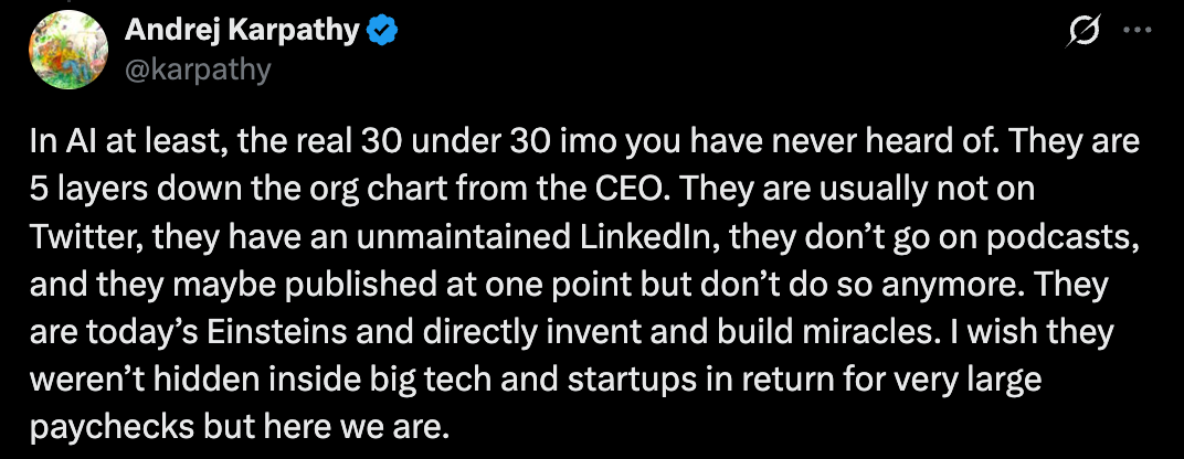 这印证了 Karpathy 的一个观察:真正改变 AI 的人往往隐藏在组织深处,他们不活跃于社交媒体,不上播客节目,甚至可能不再发表论文,但他们正在直接发明和构建奇迹。