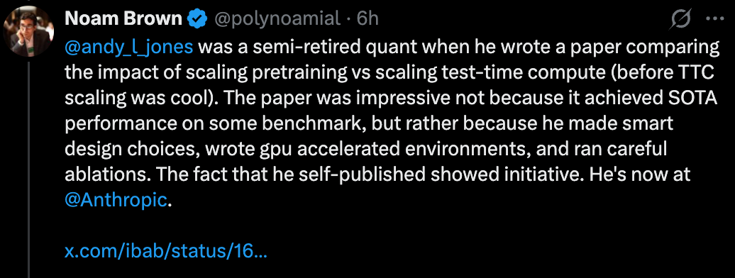3、Andy L. Jones 自行发表论文后被 Anthropic 录用,这颠覆了很多人对“论文必须发表在高影响因子期刊上才有价值”的认知。你认为在 AI 领域,什么样的研究成果更容易被顶尖实验室认可?
