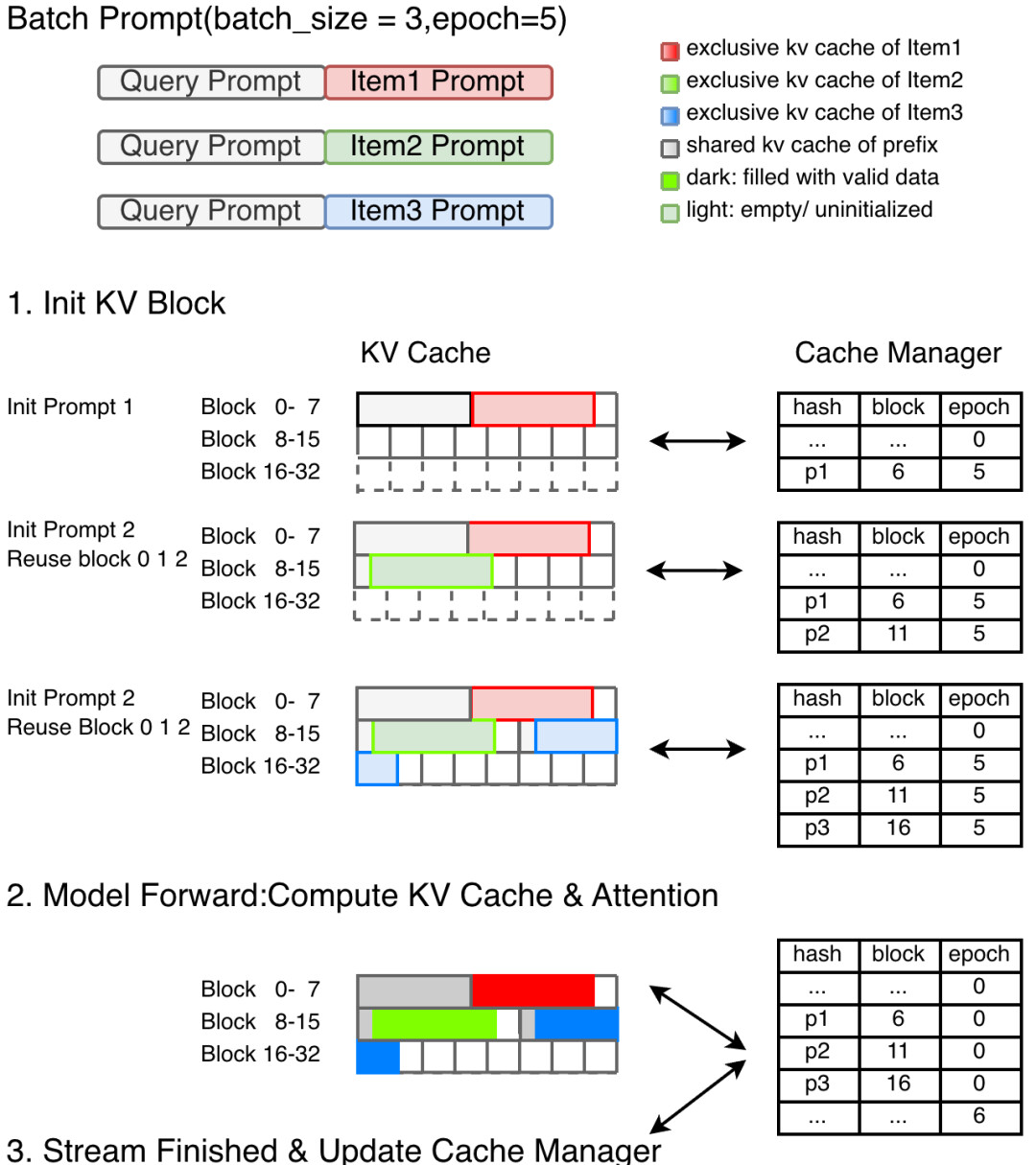 2. **批次内KV-Cache复用:** 针对同一Query与多个Item组合评估时Prompt中Query部分重复计算的问题,通过引入投机式的Block分配与注册机制,实现了批次内KV-Cache的复用,减少了计算冗余。
