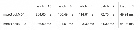 通过这个动态调优策略,我们提升了MoE层的计算性能,在端到端上获得了可观的延迟收益。从以下实验结果可以看出,该优化在小批次下性能提升更明显,这也符合我们的预期:批次越小,Token分配越容易出现稀疏现象,动态调优优势也更明显。