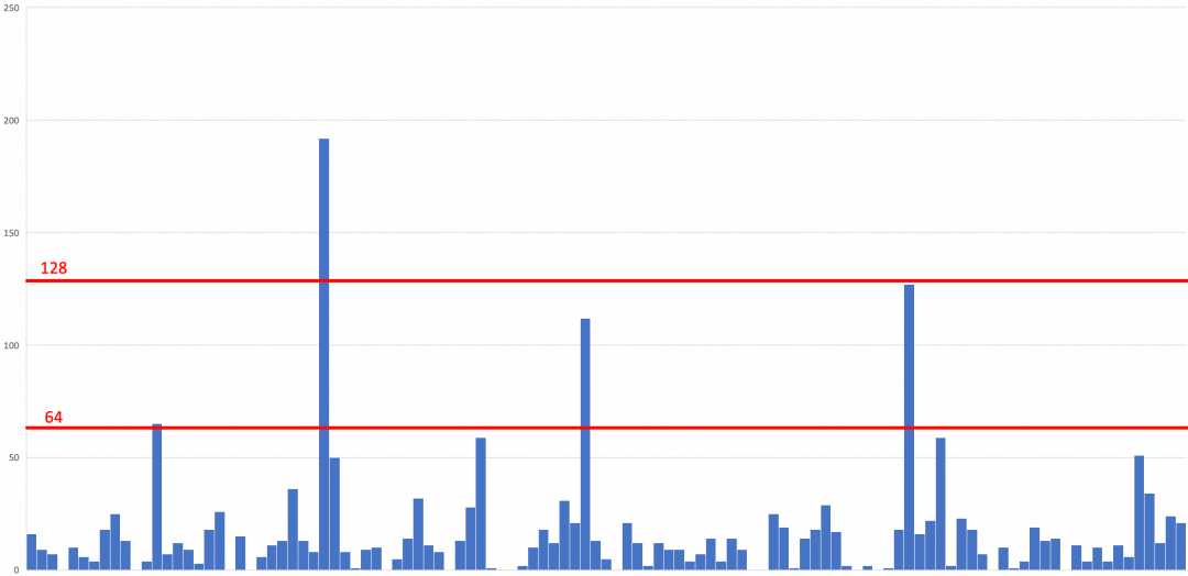 在小批量推理模式下,输入到MoE层中的Token总数有限,经过路由分配后,每个专家实际处理的Token个数变得稀疏。我们对线上真实场景进行了采样分析(Batch Size=4,平均序列长度576),下图是各专家的Token分配情况: