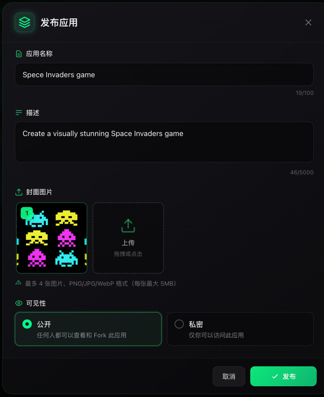 为了测试 SeaVerse 的全模态创作能力,我们尝试让它生成一款视觉效果惊艳的太空侵略者游戏,输入提示词「Create a visually stunning Space Invaders game.」