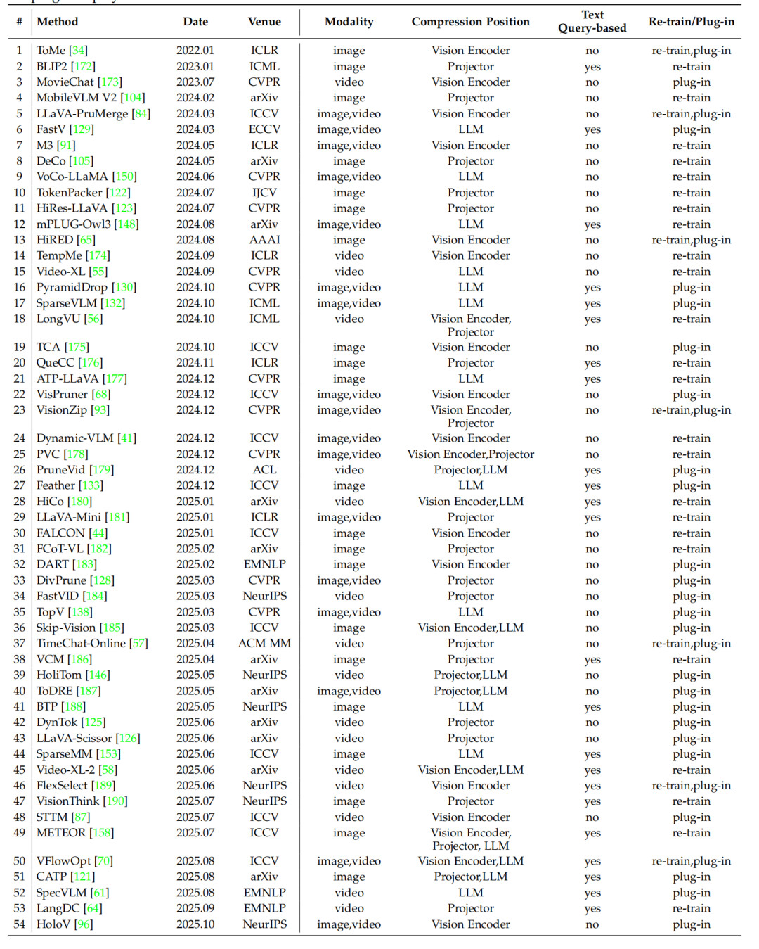 正是这种紧迫的需求催生了 MLLM Token Compression ,迅速成为研究爆点,两年内在该垂直领域产出了约 200 篇论文。但是随着研究工作的快速涌现,领域内的方法也变得极其庞杂难以归类,进一步具体到落地场景里面,往往因为方法多样而难以选择。