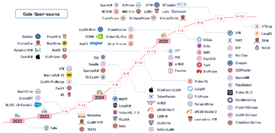 图 1. MLLMs 中 Token 压缩代表性工作时间线