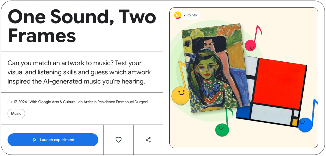 「One Sound,Two Frames」是一个探索视听联觉的创意游戏。游戏播放一段 AI 生成的音乐,然后我们从两幅画作中选出「灵感来源」。