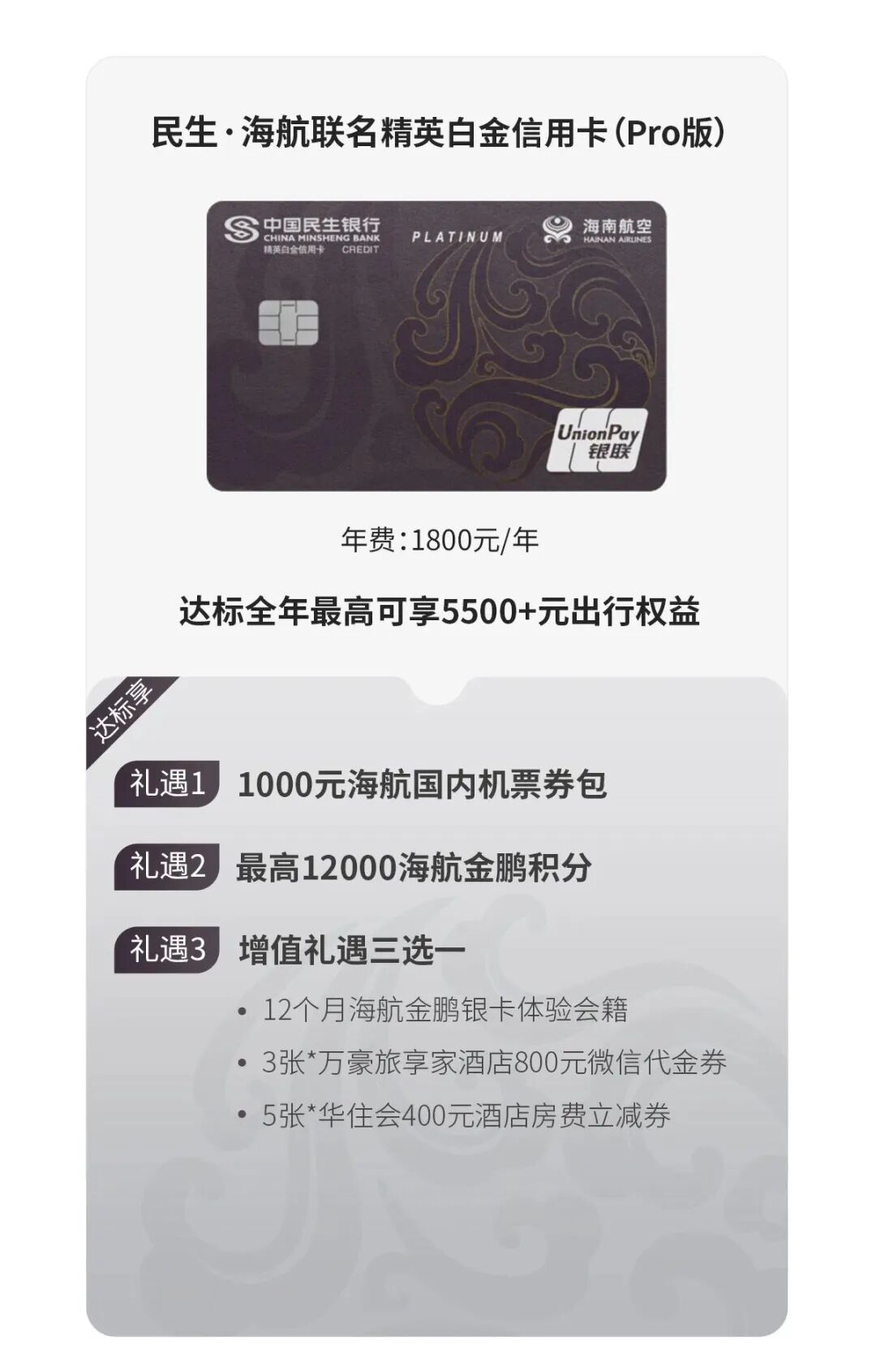 年费涨到1800,不变的是每年12000里程和消费达标门槛,3选1里的海航银卡给了12个月,也可以选3张800元万豪代金券。