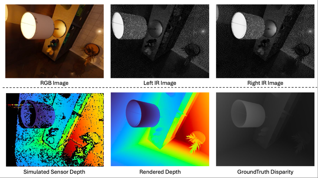 数据生成管线的一条合成数据样本。每个样本包含一幅 RGB 图像、一幅渲染得到的理想深度图、一对带有散斑图案的立体图像、对应的真实视差图,以及通过半全局匹配(SGM)计算得到的模拟传感器深度图,用以逼近真实世界主动式深度相机所产生的成像伪影。