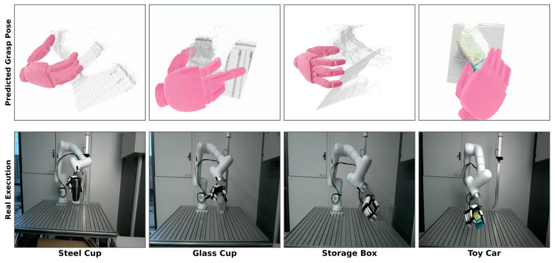抓取姿态生成与真实世界执行。上图:将预测的抓取姿态以灵巧手形式叠加在由精细深度重建的点云上进行渲染。下图:机器人系统在每个目标物体上成功执行抓取的场景。