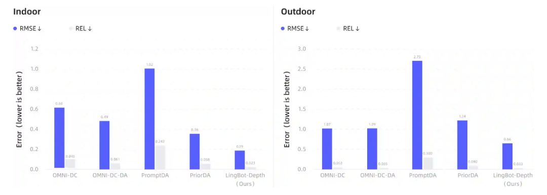 研究团队将基于 MDM 预训练得到的模型 LingBot-Depth,与多种当前主流方法(如 OMNI-DC、PromptDA、PriorDA)进行了正面对比,并设计了两种极具现实意义的评测协议。