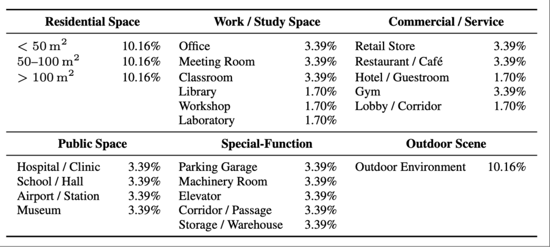 蚂蚁灵波团队在真实世界 RGB-D 采集数据在不同场景类别下的分布情况。