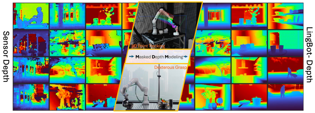 在这个思路的指引下,掩码深度建模方法(Masked Depth Modeling, MDM)应运而生,构建了 LingBot-Depth 的根基,通过算法对传感器输出进行增强,使机器人获得更完整、更稳定、更可用的深度图。