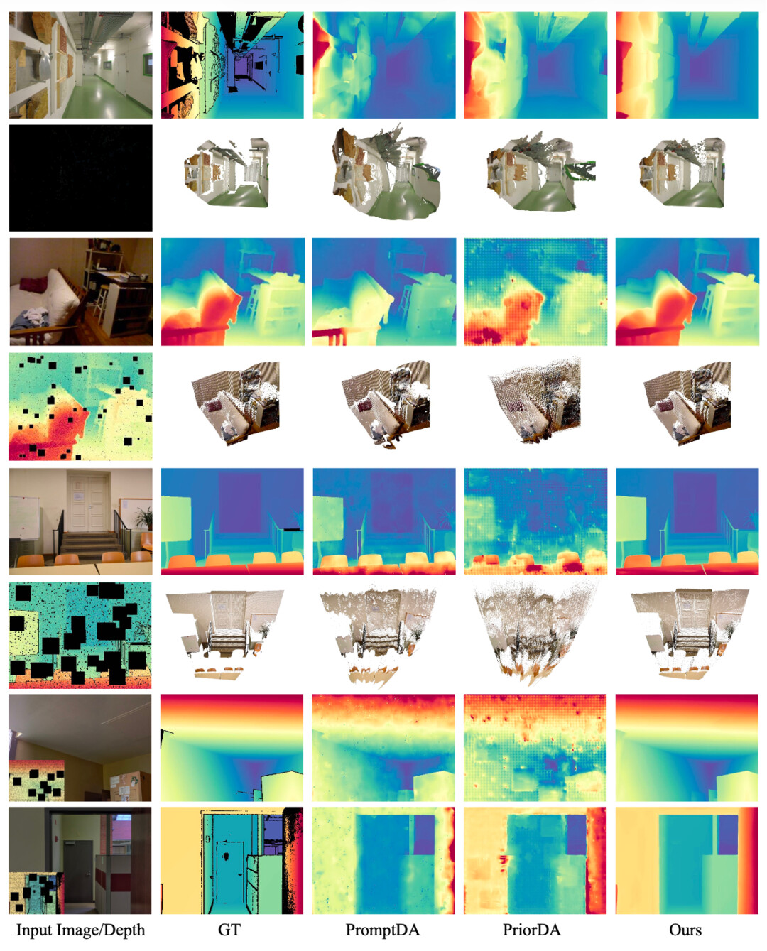 尤其是在「极端」条件下,其 RMSE 相比此前表现最好的 PromptDA 仍有显著下降,说明模型并不是靠「记住干净数据」,而是真正学会了在结构严重缺失、测量高度不可靠的情况下恢复合理的三维形状。
