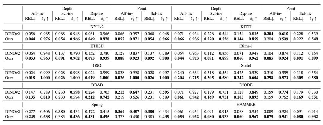 使用不同预训练主干网络(DINOv2 与 MDM 方法)的 MoGe 单目深度估计结果。在 10 个多样化的基准数据集上,从仿射不变、尺度不变以及视差不变三类评价指标出发,系统评估了深度预测和点云映射的精度表现。