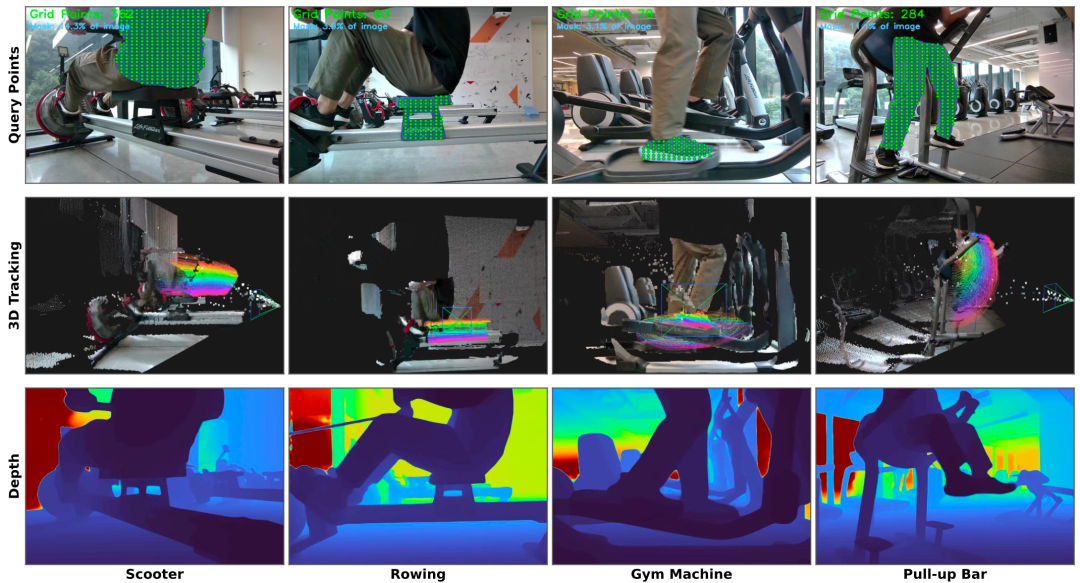 动态三维点追踪结果。上:目标物体上的查询点;中:被持续追踪的三维轨迹(按时间以彩虹色编码);下:对应的深度图结果。