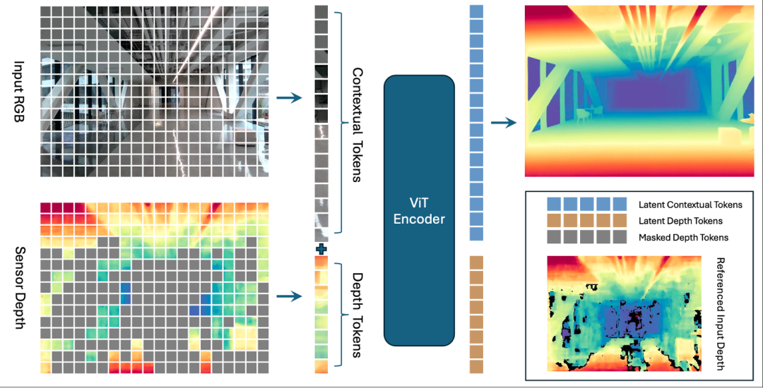 在具体实现上,LingBot-Depth 采用了标准的 ViT-Large 作为编码器主干,但对输入建模方式进行了针对 RGB-D 场景的定制。