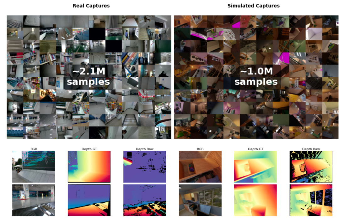 数据管道整理的 MDM 数据概览。展示了共计 210 万真实采集样本及模拟采集样本,同时展示了 RGB-D 输入和对应的 GT 深度图。