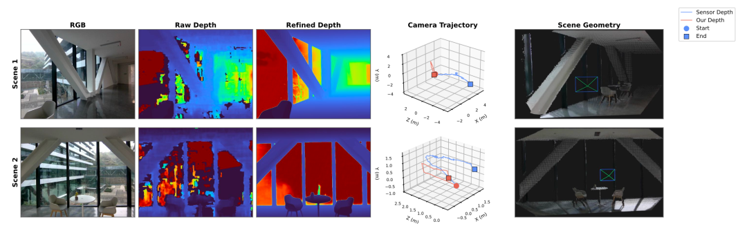 相机追踪与场景重建结果。从左到右依次为:RGB 输入图像、原始传感器深度图、模型生成的精细深度图、估计得到的相机轨迹,以及最终重建的场景几何结构。