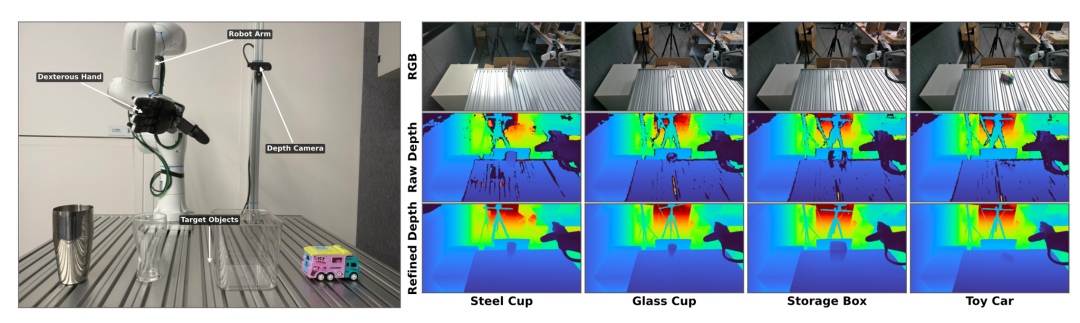 抓取实验的定性结果。左图:包含机械臂、灵巧手和深度相机的硬件系统示意。右图:四个目标物体的 RGB 图像、原始传感器深度图,以及 LingBot-Depth 方法生成的精细深度图。对于反光物体(钢杯)和透明物体(玻璃杯、收纳盒),原始深度图严重缺失,而 LingBot-Depth 的方法能够生成完整且几何上准确的深度图。