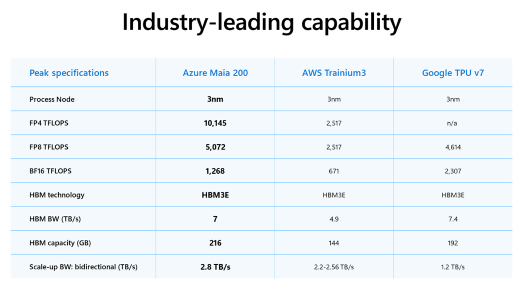 这些使得 Maia 200 成为任何超级计算平台中表现最强的第一方硅片,其 FP4 性能是第三代 Amazon Trainium 的三倍,FP8 性能超越了谷歌第七代 TPU。